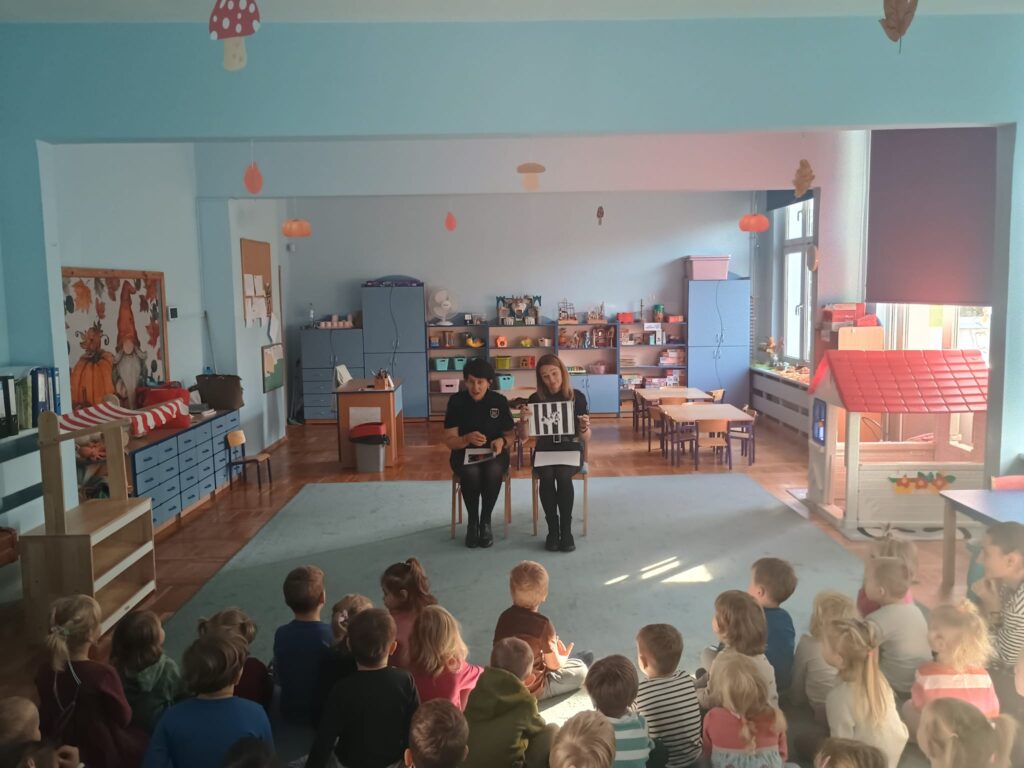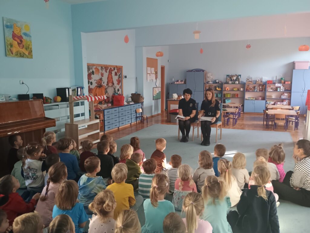 Podczas spotkania strażnicy prowadzili zajęcia edukacyjne dostosowane do wieku dzieci. Rozmawiano m.in. o tym, jak bezpiecznie poruszać się po drodze: kiedy i jak przechodzić przez pasy, dlaczego należy zwracać uwagę na sygnalizację świetlną oraz co to są znaki drogowe. Przedszkolaki aktywnie uczestniczyły – rozpoznawały znaki, zadawały pytania i dzieliły się swoimi obserwacjami.
